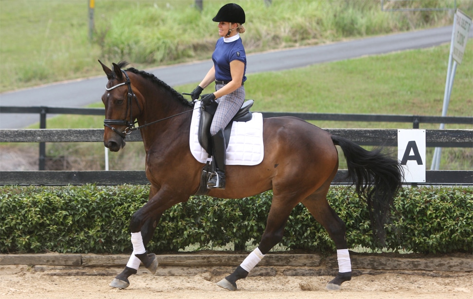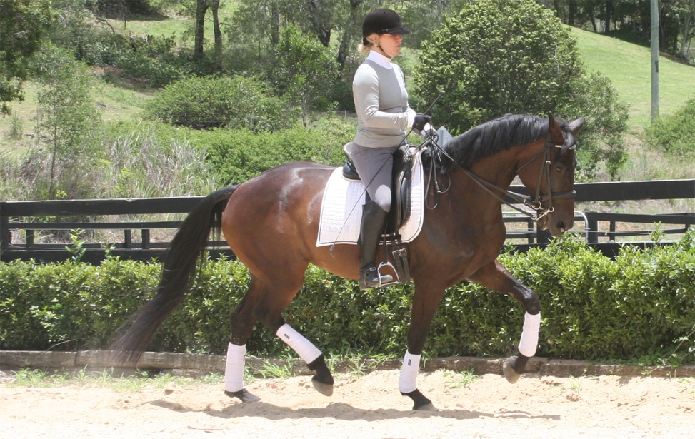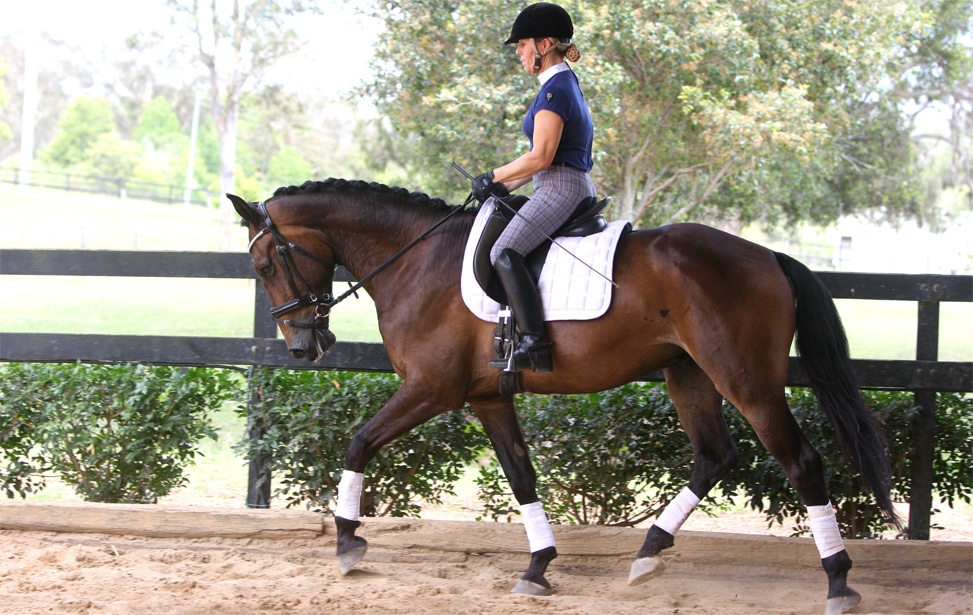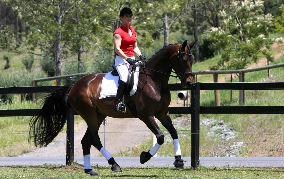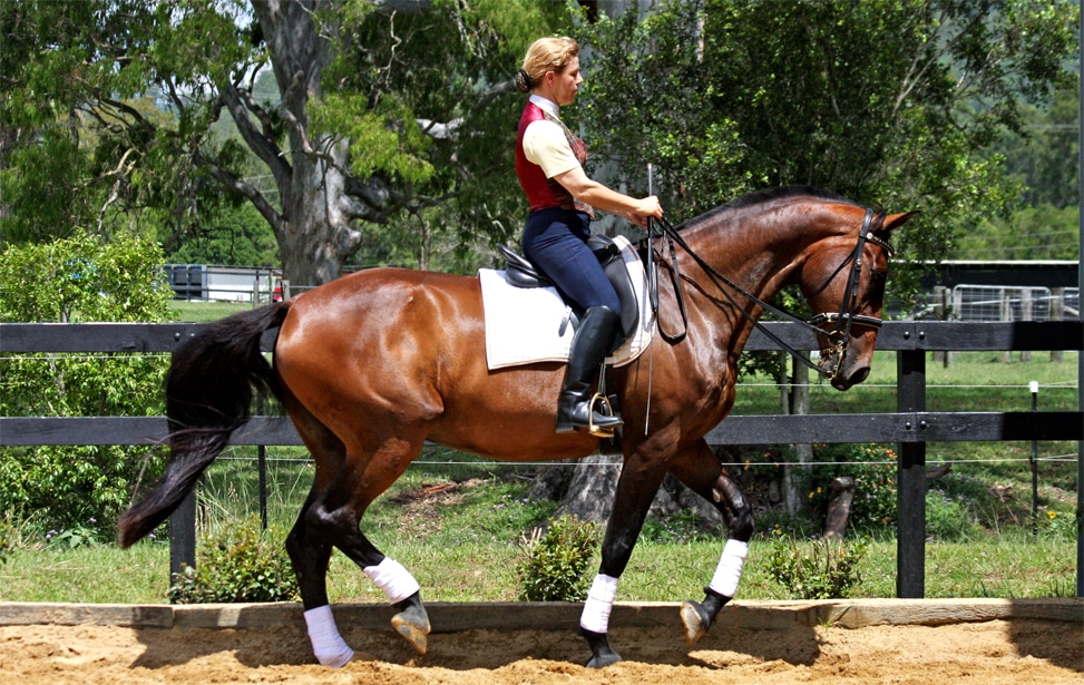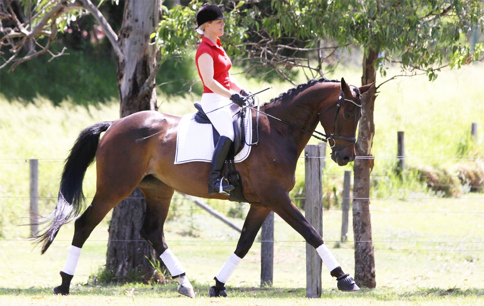 As his pedigree states, this is dressage royalty! Sandro Hit needs no introduction; his offspring has proven over and over again to be outstanding, majestic and elegant. His dam, IHB Weltina is by German State stud "Celle" sire of the century, Weltmeyer. She herself was a wonderful riding horse with a great hind leg coupled with a kind and willing nature. Calimero has been a gem to train from day one and like his dam, he is always willing to do the best he can. He is such a kind horse to have around as well, we just can't fault him. His movement has got natural cadence and an ability to collect, with a flair for piaffe and passage. Calimero is fun to jump as well and has been easy over cross country fences including ditches and water.